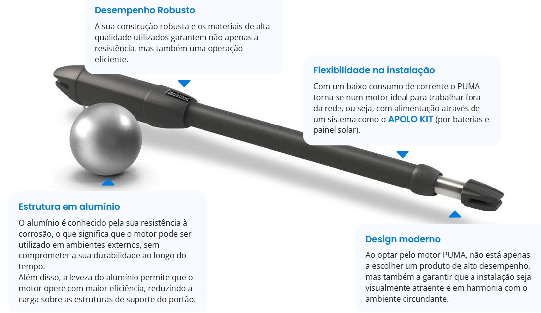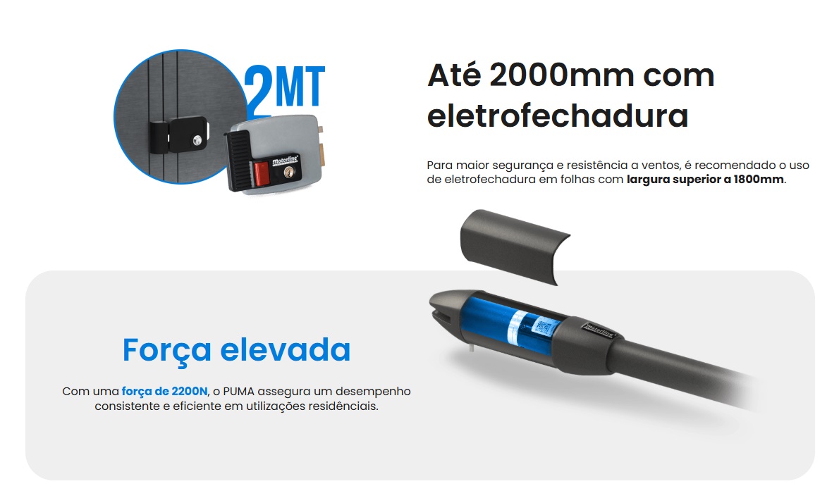 Kit composto por 2 motores, acessórios, fotocélulas, 2 emissores rolling code e quadro com receptor incorporado, com arranque e paragem suave. A construção robusta em alumínio proporciona uma elevada força e resistência, incluindo dois suportes de fixação em aço zincado, com medidas estudadas para facilitar a instalação. Desenvolvido com característica inovadora, permitindo ao instalador uma rápida e prática transformação de motor direito para esquerdo, ou vice-versa. Para uso residencial de folhas até 2m cada folha, com curso de 400mm