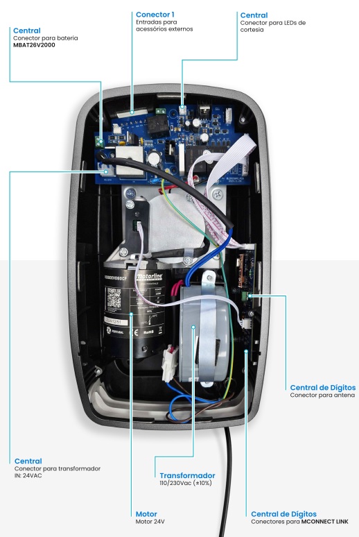 Kit composto de calha de aço (diferentes tipo à escolha do cliente), acessórios de fixação, placa de controlo com receptor incorporado e dois emissores quadricanais.